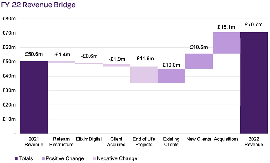 Throughout the 2022 financial year, Elixirr’s focus on growing existing relationships and bringing in new clients resulted in underlying organic growth of 18%. When it came to obtaining new clients, Elixirr secured a £10.5 million boost in revenues – but just as impressively, the firm managed to bring in an extra £10 million in new contracts from existing clients.